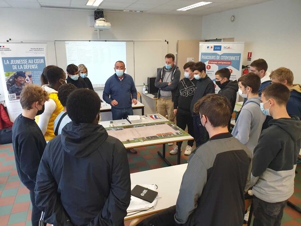 Cette journée a été réalisée en partenariat avec le service militaire volontaire (SMV), le 8ème régiment du matériel et l’Office national des anciens combattants et victimes de guerre de la Marne (ONACVG 51). Elle constituait une première animation créée récemment et coparrainée par ces trois entités pour cette classe de défense et de sécurité globales (CDSG) du lycée Etienne Oehmichen de Châlons-en-Champagne. Ateliers animés par le CSNJ de Châlons-en-ChampagneLa journée a débuté par une information sur le recensement, afin d’informer les jeunes sur leur situation dans leur parcours citoyen. Témoignage de militaires du 8e RMATLes jeunes ont ensuite pu rencontrer des militaires du 8ème régiment du matériel de Mourmelon-le-Grand, venus partager leur expérience opérationnelle et répondre aux interrogations des jeunes. Course d’orientation mémorielle de l’ONACVGL’après-midi s’est déroulé à la Butte des Fusillés, où une course d’orientation mémorielle a été organisée avec l’ONACVG 51. |